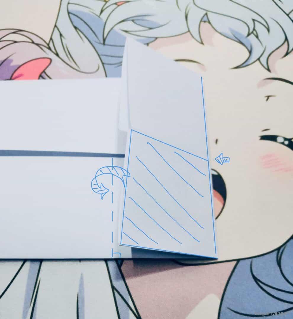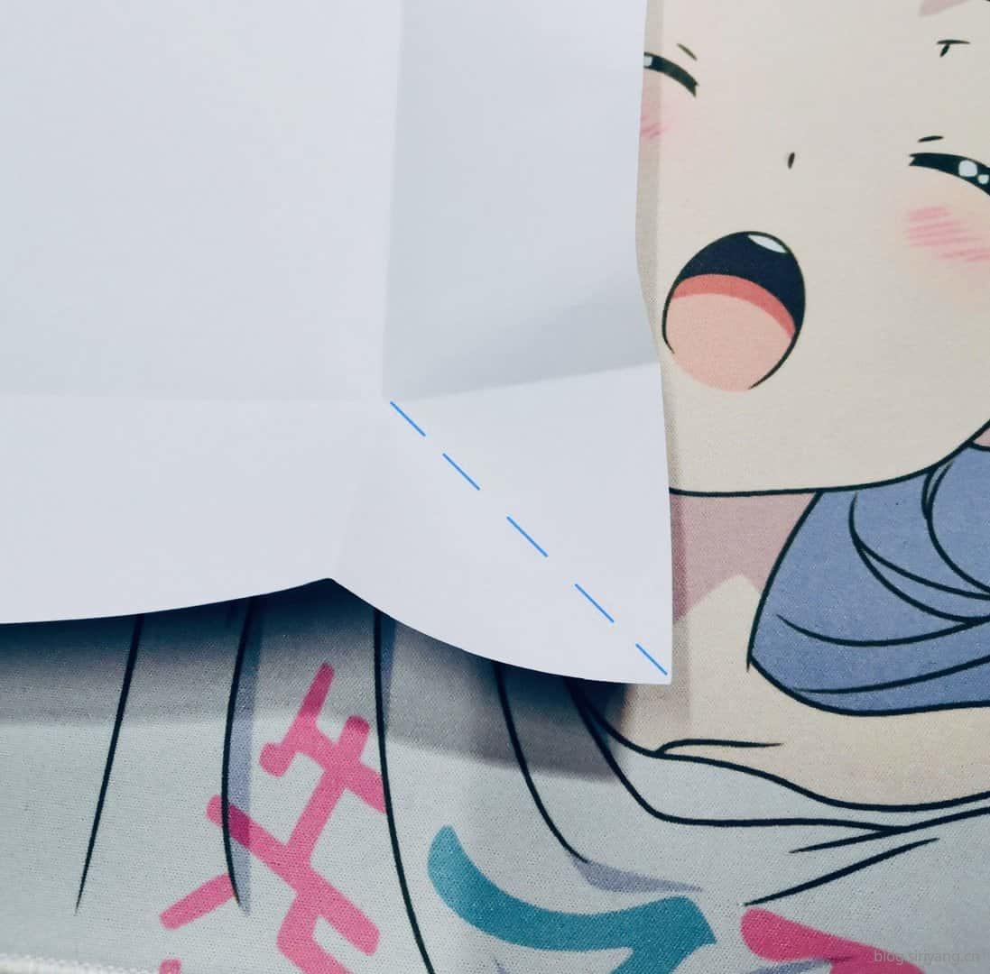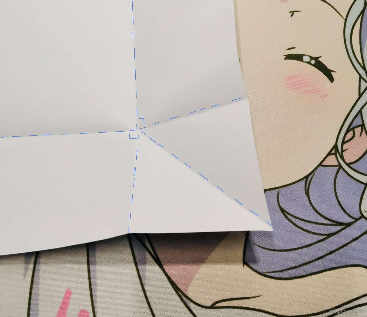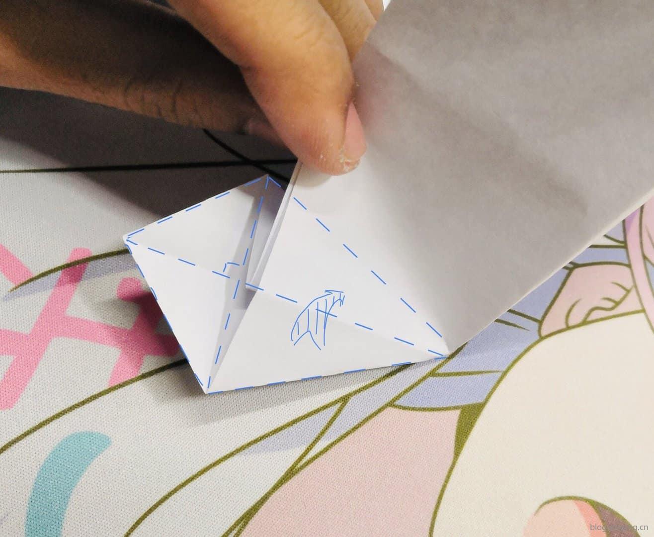 把两边向中间对折以后,再把下边向上翻折,如图中一样保持两边垂直,其中左下角轻轻压一个印记,斜边也不用压实。