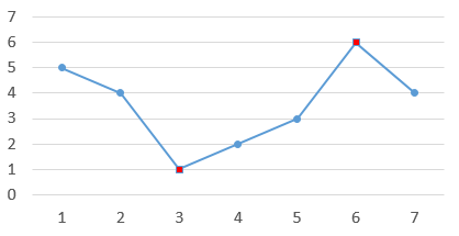 给定n个整数表示一个商店连续n天的销售量。如果某天之前销售量在增长,而后一天销售量减少,则称这一天为折点,反过来如果之前销售量减少而后一天销售量增长,也称这一天为折点。其他的天都不是折点。如下图中,第3天和第6天是折点。