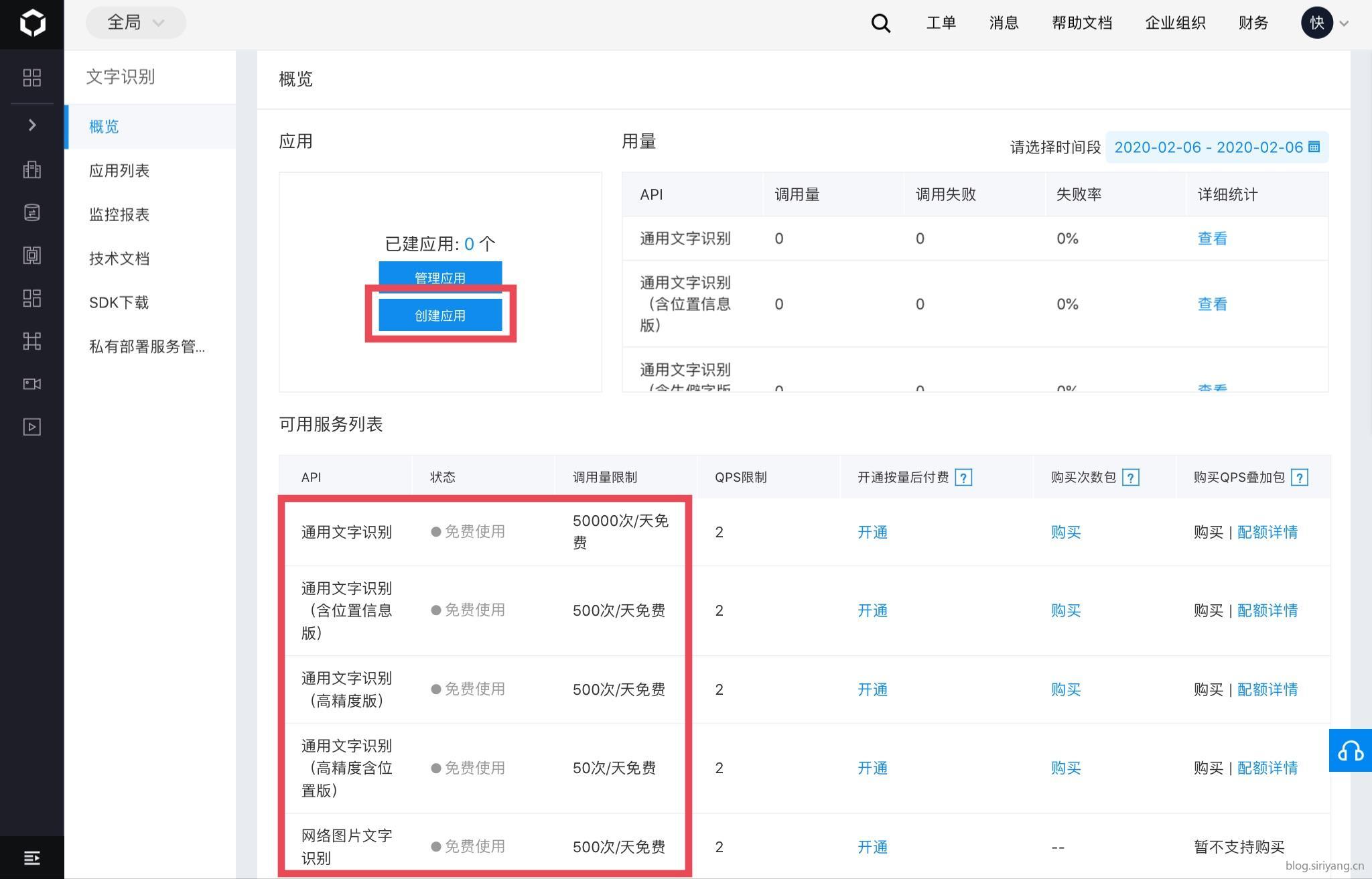 然后在这个界面下方可以看到你免费版每天的使用次数,可以识别的种类特别多,我准备选用的是不带坐标信息的通用文字识别高精度版,每天可以白嫖500次,我一个人用的话完全足够了。要真是不够用,用完了大不了切换到普通版本将就着用,正常使用50000次每天不可能不够用,除非你写个for循环使劲糟蹋…