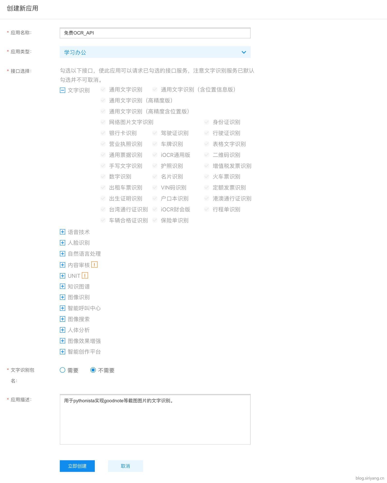 应用配置这里把名字和备注填好就行了,其他没啥好改的,所有类型的文本识别接口都默认打开了。