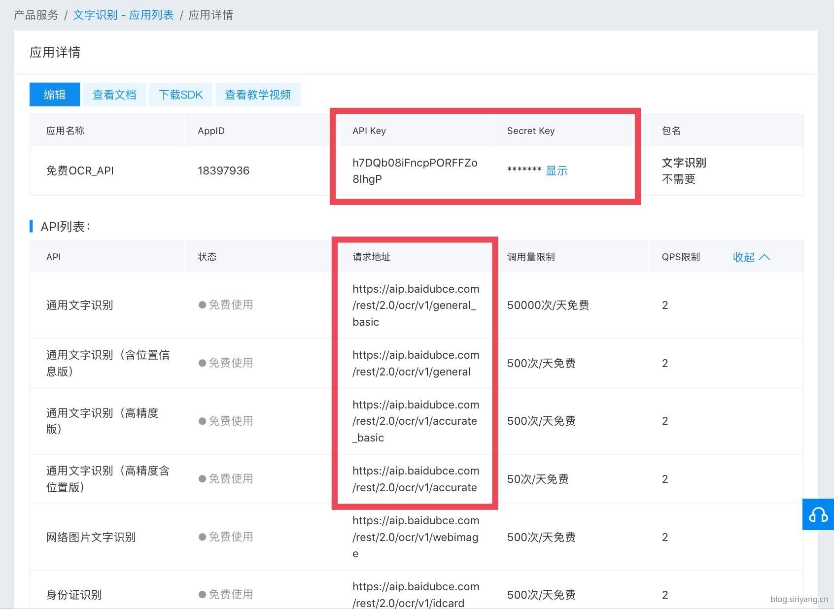 在使用之前首先要配置一点信息,就是我们上面注册账号获得的API密钥,并在下面填上你要选择使用的相应版本的接口链接,我默认已经为你填上了通用文本高精度版本了。
