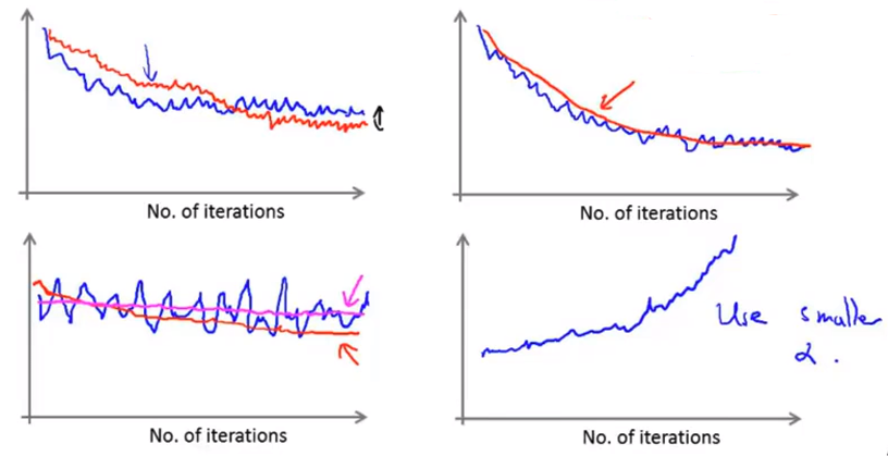 在 $\alpha$ 足够小的时候,$J(\theta)$ 应当在每一轮迭代后下降。但是如果 $\alpha$ 太小,那么梯度下降的收敛速度将非常慢。