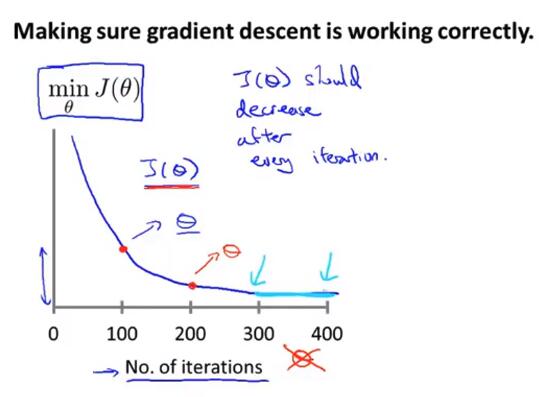 通过绘制迭代次数与最小损失值($min_\theta J(\theta)$)的函数曲线,可以判断梯度下降算法是否正常运行。当曲线趋近于平坦的时候就代表差不多收敛了。