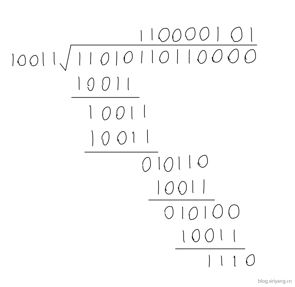因此,余数是1110,传输的数为11010110111110。在传输过程中最后两位变成0,接收端能够发现,因为11010110111100除以10011余数不为0。