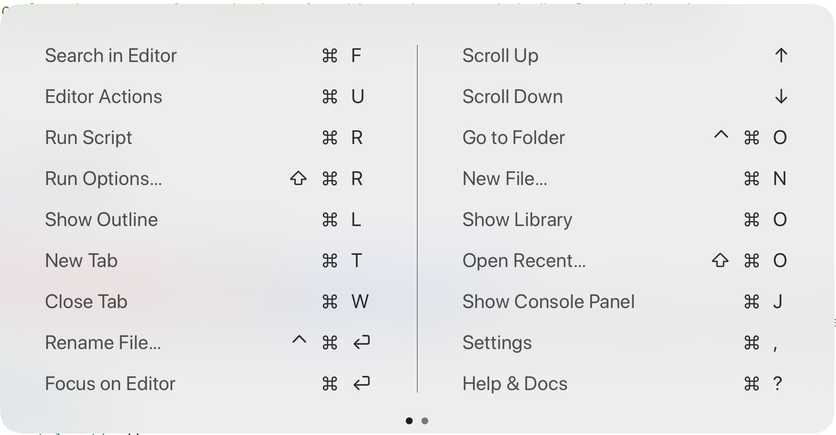 随时按住Cmd(⌘)键以显示可用快捷键列表。某些快捷方式仅在某些模式下可用,例如在编辑代码时或在控制台中。