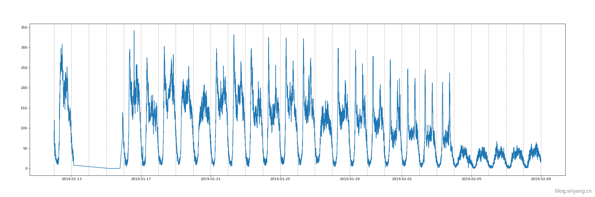 可见数据有明显的周期性(以天为周期),其中1月有长达两天半的缺失值。在2月4日开始进入春节假期,车流量明显减少。