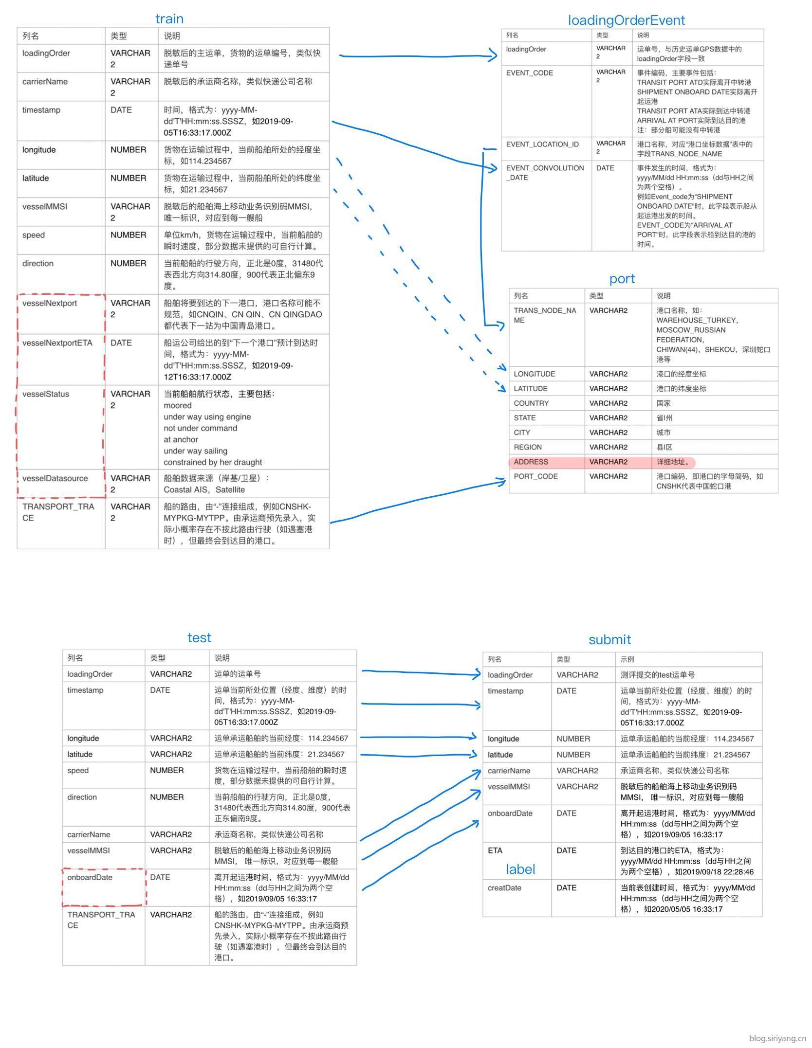 正式赛训练数据一共有三张表,分别是历史运单GPS数据、历史运单事件数据、港口坐标数据。其中其主要作用的是历史运单GPS数据,该数据文件解压后共21G,有1.4亿多条数据,且字段也很多。为了理清各表之间的关系,作如下关系图:
