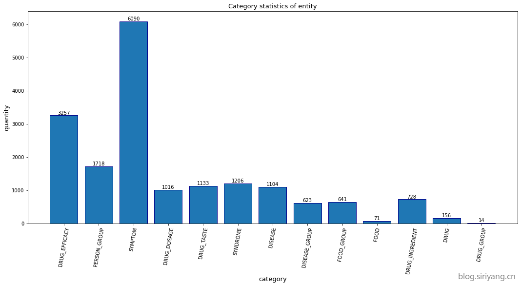 数量最多的一种实体是SYMPTOM,有6090个;数量最少的一种实体是DRUG_GROUP,有14个。样本不平衡。