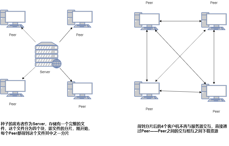 - 每个用户端节点都同时是文件下载者和提供者