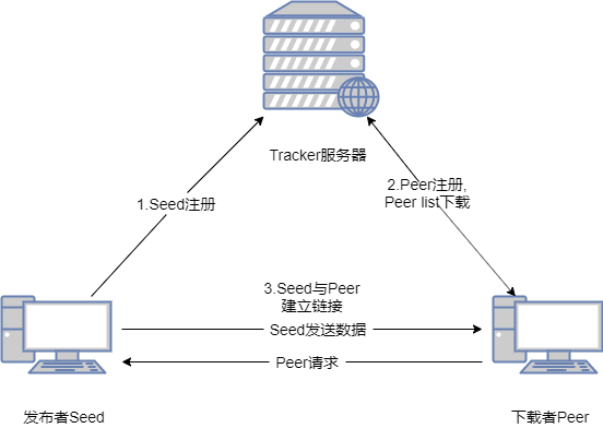 下载时,BT客户端首先解析种子文件得到 Tracker 地址,然后连接Tracker 服务器。Tracker 服务器回应下载者的请求,提供其他下载者(包括发布者)的IP。下载者再连接其他下载者,根据种子文件,两者分别告知对方自己已经有的片段,然后交换对方所没有的数据。此时不需要其他服务器参与,分散了单个线路上的数据流量,因此减轻了服务器负担。