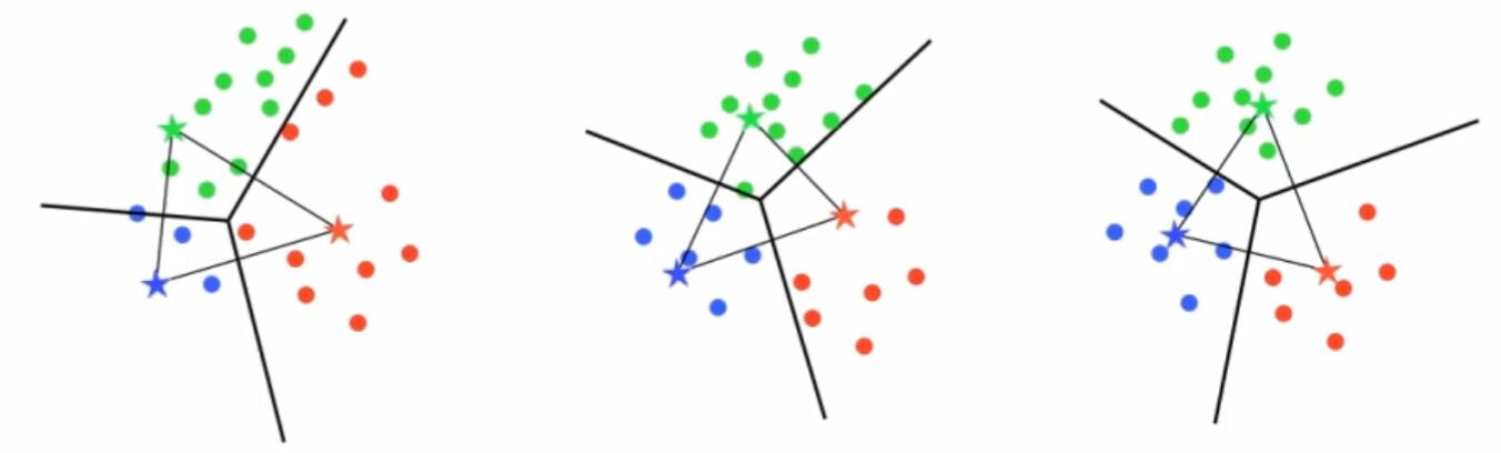 - 根据当前的划分情况,重新计算每类的中心(均值)