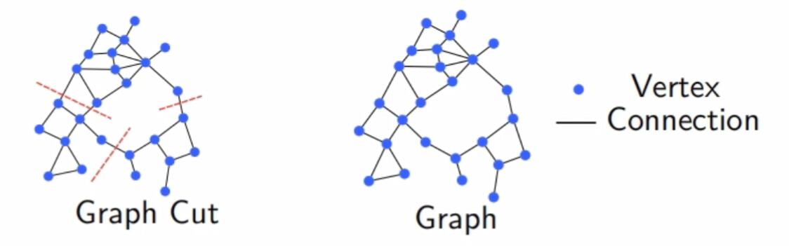 我们先要将数据进行构图,使用图来进行分析可以直观的建模。数据是一个低维向量,每个节点是一个数据,节点和节点之间的边的权重是由节点向量的欧氏距离就算出来的一个相似度。之所以叫图割是因为在类和类之间的边做切割。