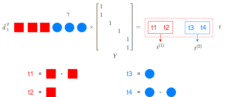 当更新 $y_1$ 时,令 $t=\tilde{d}_1^T Y$,则 $t_1,t_2$ 包含近邻值(红色方块),$t_3,t_4$只包含 $\gamma$ (蓝色圆)。