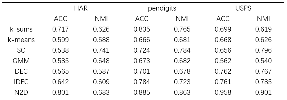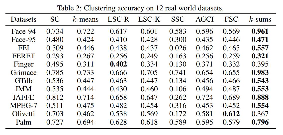 接下来我又在几个更为大型的公开数据集上进行性能测试并与其他算法进行比较,如下表所示,k-sums在各数据集上的表现均要优于k-means算法,同时与其他几种算法相比性能也较为靠前。