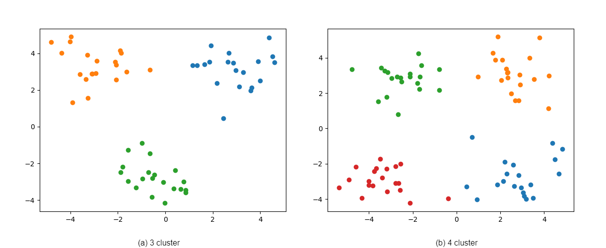 当我将明显分簇为4的数据集人为强行指定划分为3类的时候,由下图可以看出,k-sums还是倾向于去找一种较为均匀的划分方式,而使用k-means划分出来则会出现明显不平衡的一类。