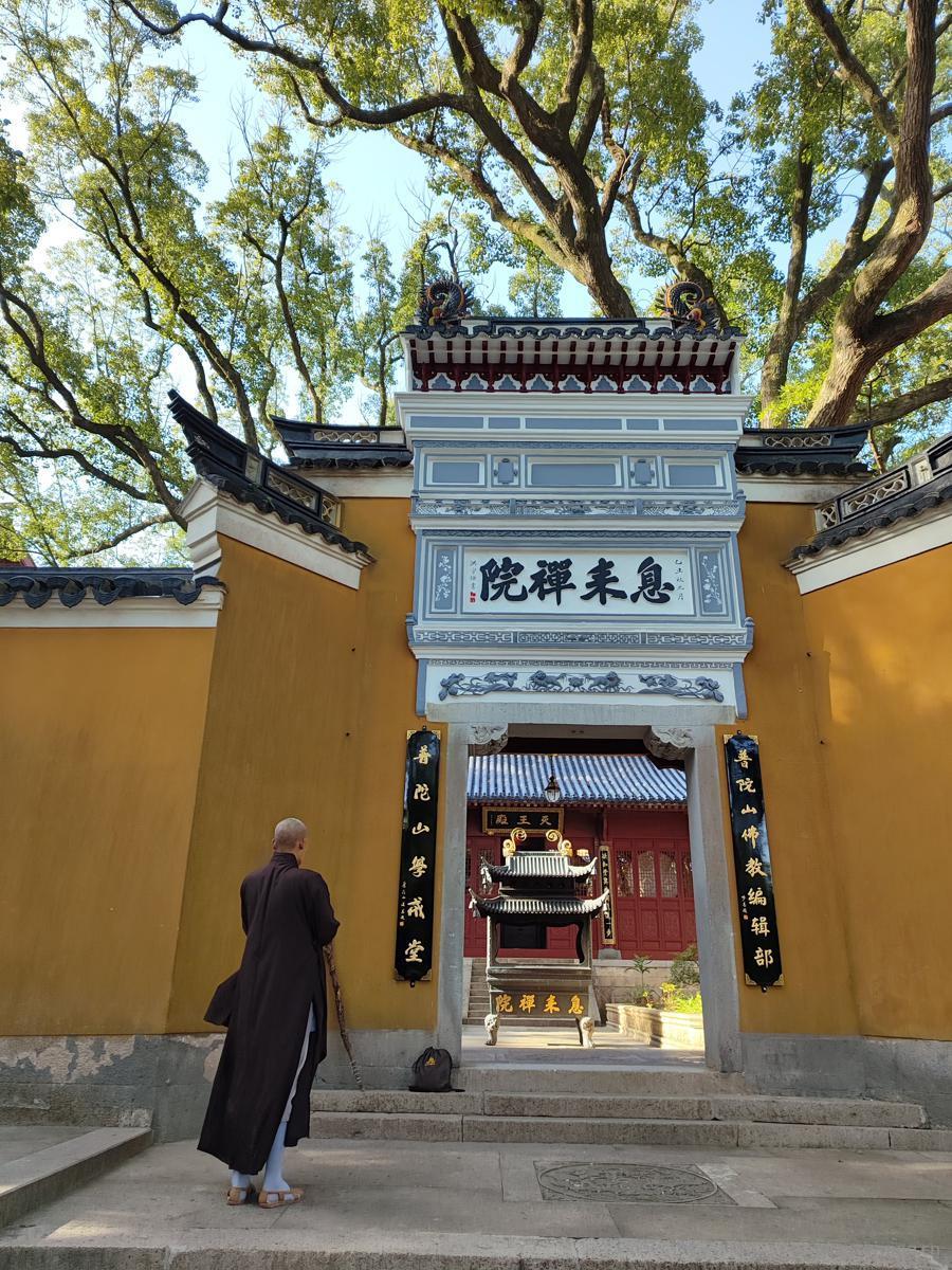 紧挨着普济寺有一个息来禅院,院内传来阵阵钟声。一个僧侣打扮的人正在门口不停的跪拜,引起人们的驻足围观。我们本以为他是这个寺庙里的僧人,但是没过多久一队保安过来把他赶下台阶,还呵斥他把放在门口的手杖和包一并拿走。这个僧人即使被赶到了警戒区域以外,也仍然在不停的朝着院门方向跪拜。