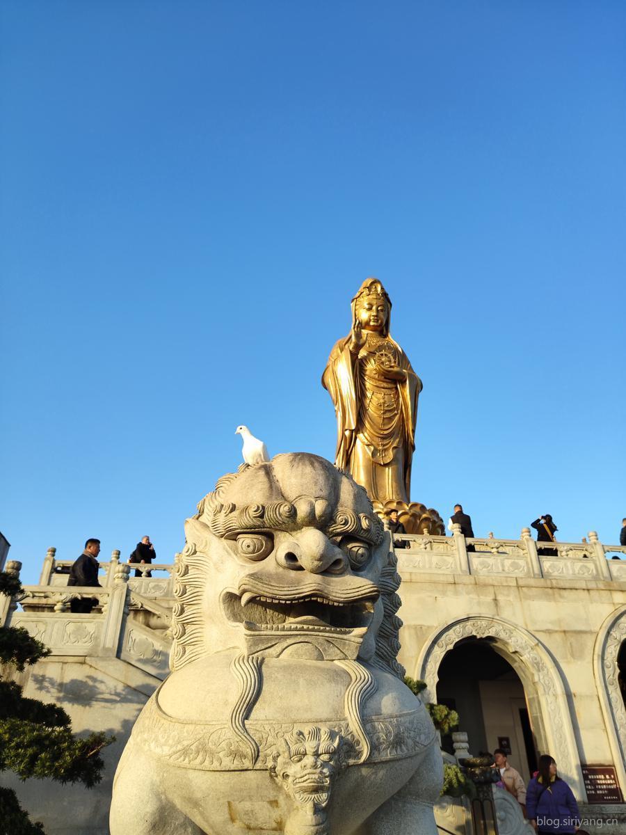 南海观音是普陀山的地标性建筑,也是我最期待的景点。还在渡轮上时,就能在老远的地方看到屹立在山顶的佛像。当真正靠近了从下进行仰拍,却总感觉拍不出肉眼所见的那种高大宏伟的冲击感。倒是这只站在石狮子上和我大眼瞪小眼的鸽子颇有喜感。