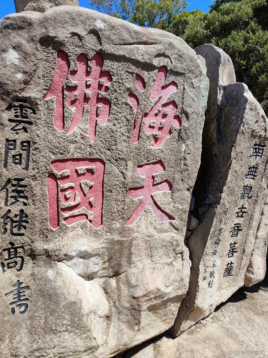 绕到巨石下面,可以发现刻有“海天佛国”巨大字样。看样子是一个叫云间侯继高的人写的,感觉字还是蛮新的,这位置常年风吹日晒怎么也得风化了,估计就算是古代刻上去的后来应该也是维护修复过的。
