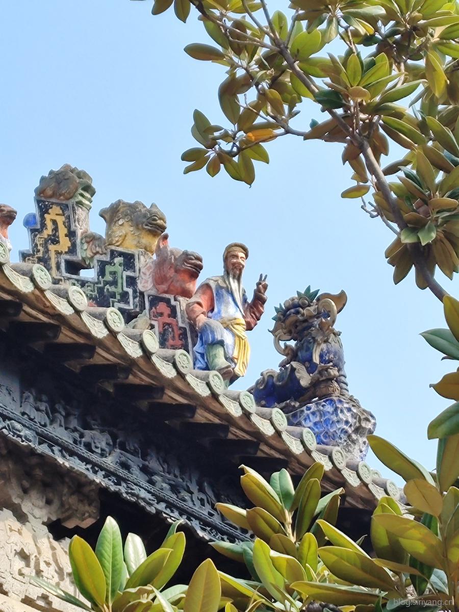 屋檐上的各种彩塑确实鲜艳好看,还拍到了比耶手势的雕塑。看了下展馆里讲述陈家祠由来历史的简介了解到,新中国成立后,陈家祠被改造为印刷厂,遭受了严重的损害。目前看到的所有彩塑都是近几十年工匠修复的。