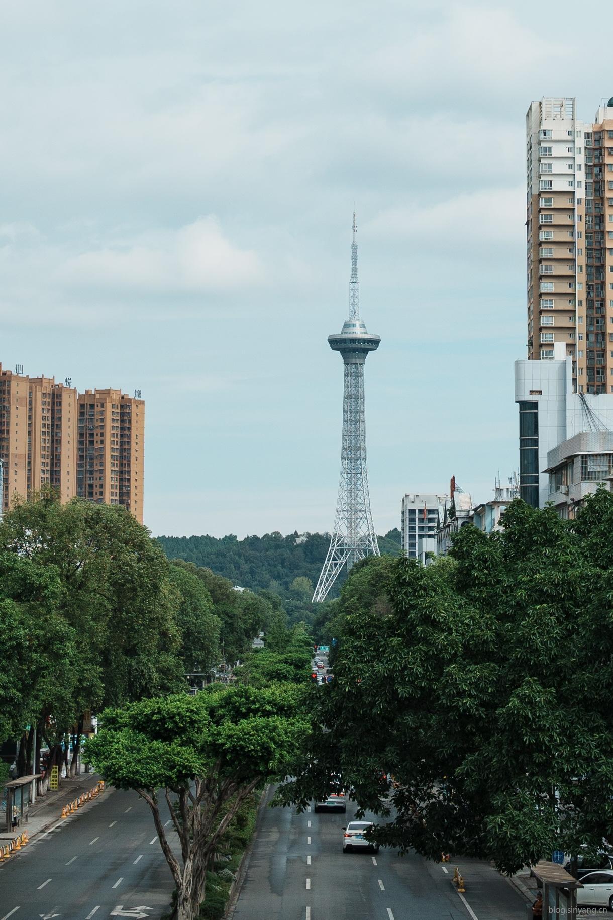 这两年德阳沿河绿道的桥头路口新修了供自行车通行的高架,在岷江桥的高架上能拍到楼宇间的电视塔。