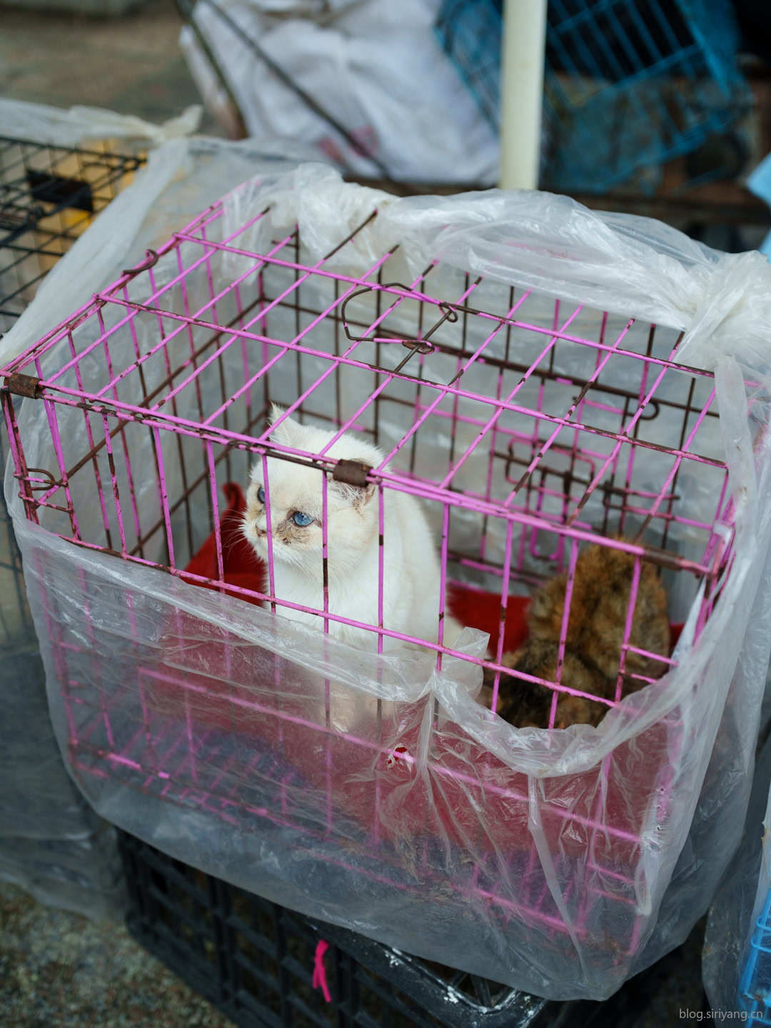 新华书店对面经常有卖小动物的商贩。其中这只用着蓝色瞳孔的白色猫猫最为好看。但是在笼子中的它非常伤感的看着外面的世界,眼角湿润,随时等待被人买走。