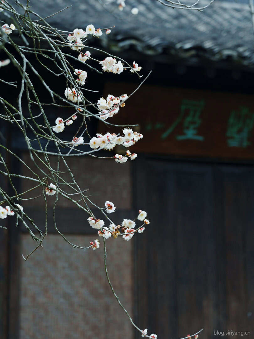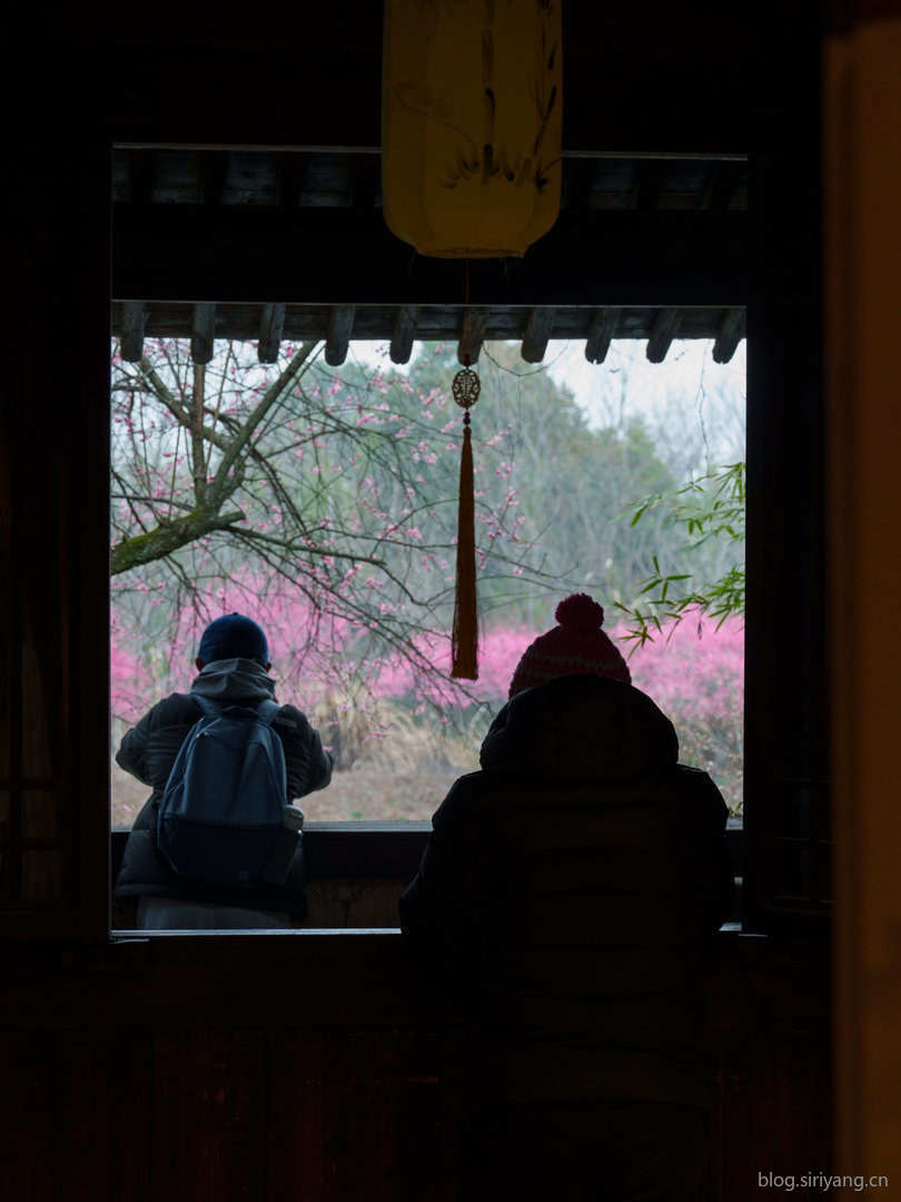 两个游客正一前一后站在屋外的栏杆前和屋里的窗沿前观赏外面的梅花,从屋内看出去,正好形成一个框架式构图。