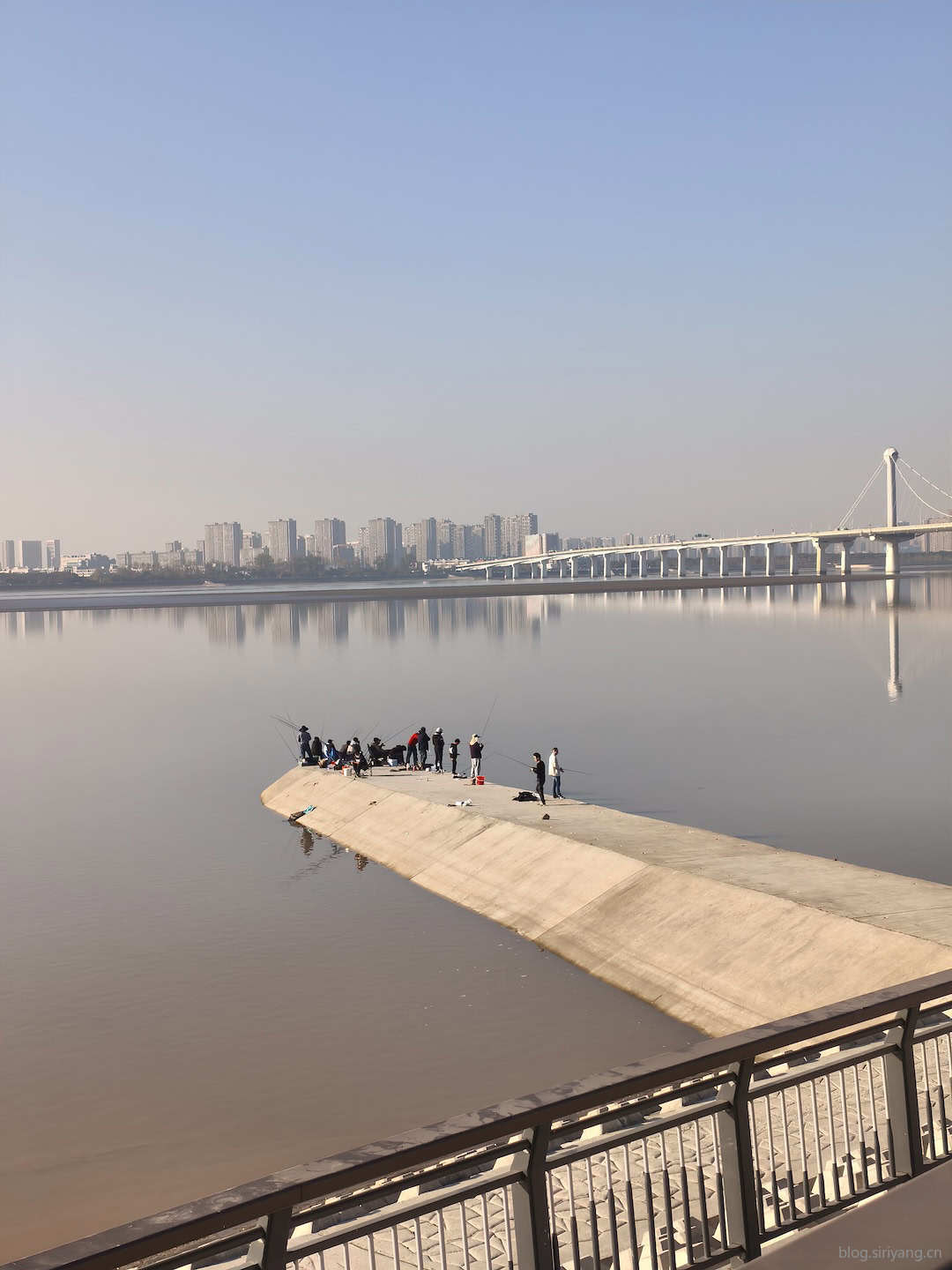 江边堤坝上好多人钓鱼,就这么一小块地方挤满了人,估计快二十个了。