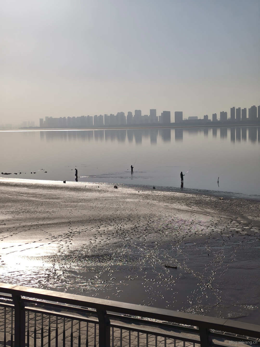 由于江边滩涂的水不深,还有很多人直接站江里去钓了。