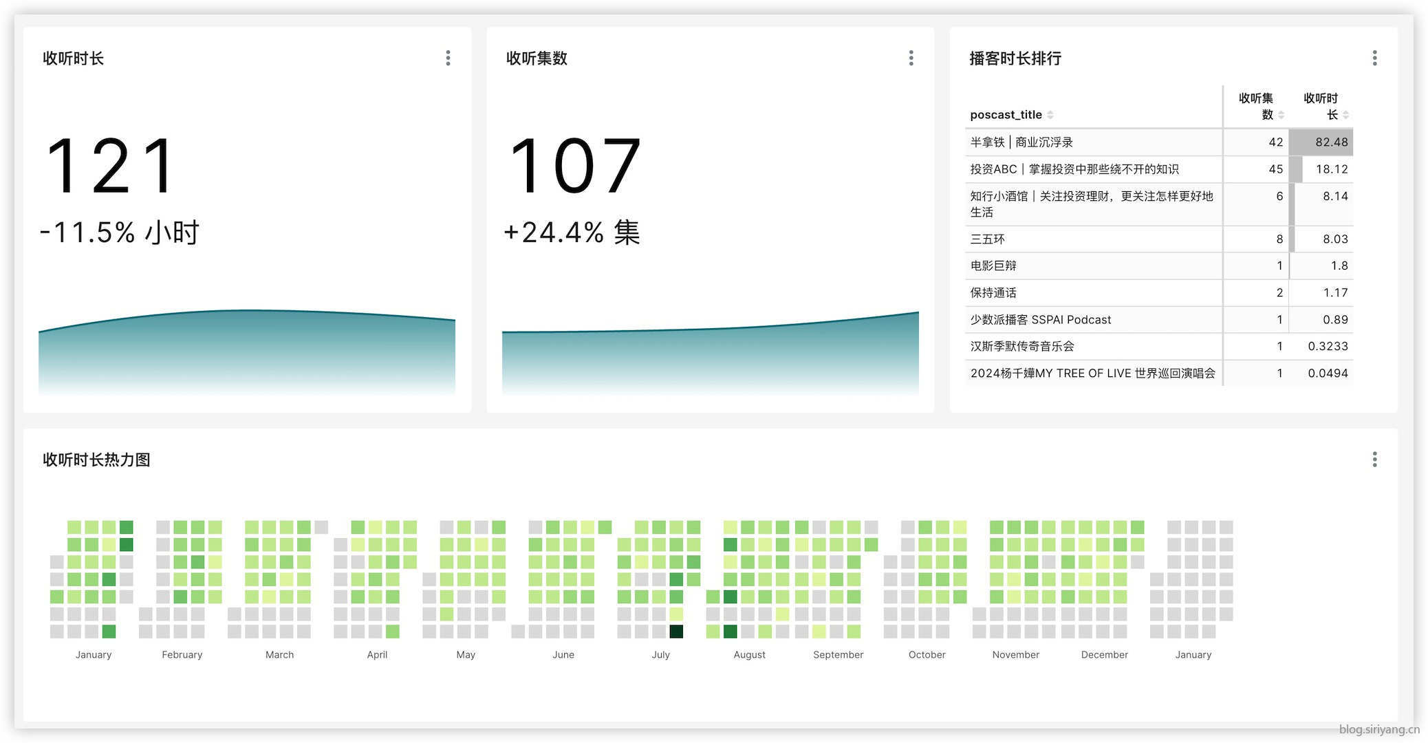 由于每天早上上班都要听播客,所以发现收听时长的热力图,其实也代表了我每天上班打卡的天数。在 7、8、9 月的周末,也会有一些收听记录。主要是在这段时间,我购入了一台台式主机,周末会玩一下《美国卡车模拟》,然后会听一会儿播客。