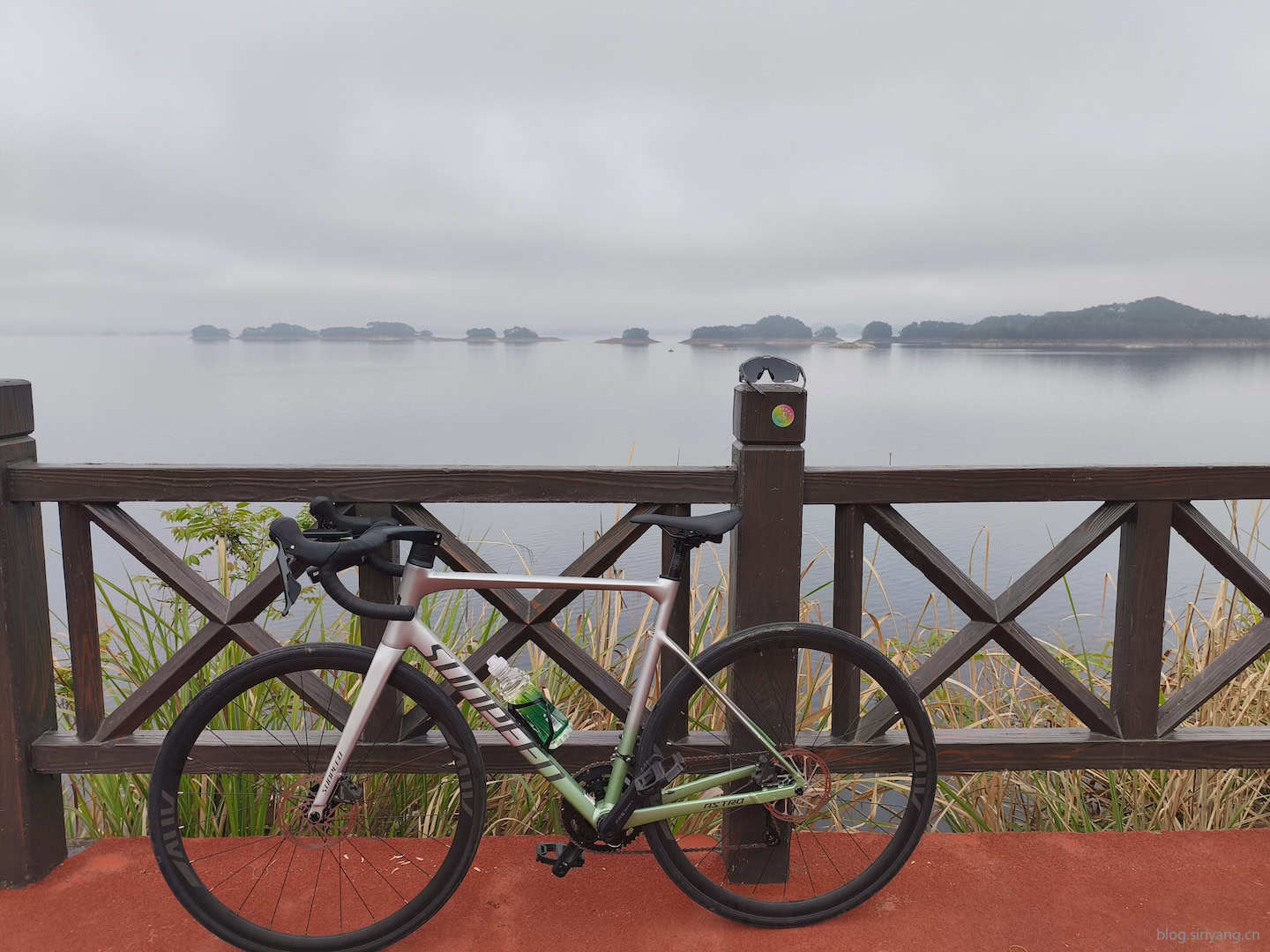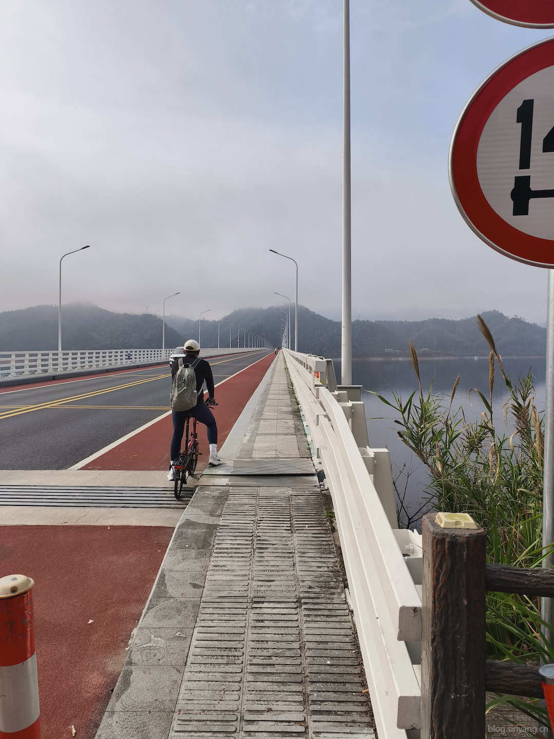 早上醒来一看时间才五点半,脑子已经兴奋的睡不着了。但还是强行逼迫自己躺在床上闭目养神到了六点左右。其实另外两个人也跟我差不多,没过多久也醒了,大家都很亢奋。早晨七点左右的千岛湖还在一层晨雾的笼罩中,气温比较低,所以特意在骑行裤和骑行服外面又套了一层运动装,背上了我的腰包准备路上装衣服。