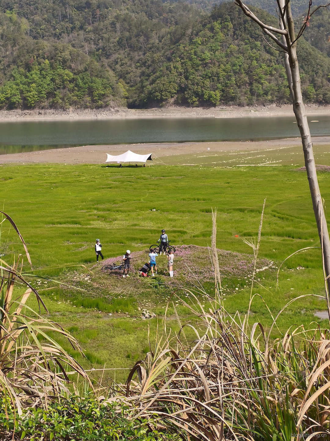 十点左右的天气开始热了起来,找了个地方停下来把长衣、长裤脱下来放到腰包里,涂上防晒继续前行。在更衣休息的绿道旁边,有一片沿湖的大草坪,一群骑行的人在草坪里开满鲜花的山包上拍照,感觉景色还蛮好看的。