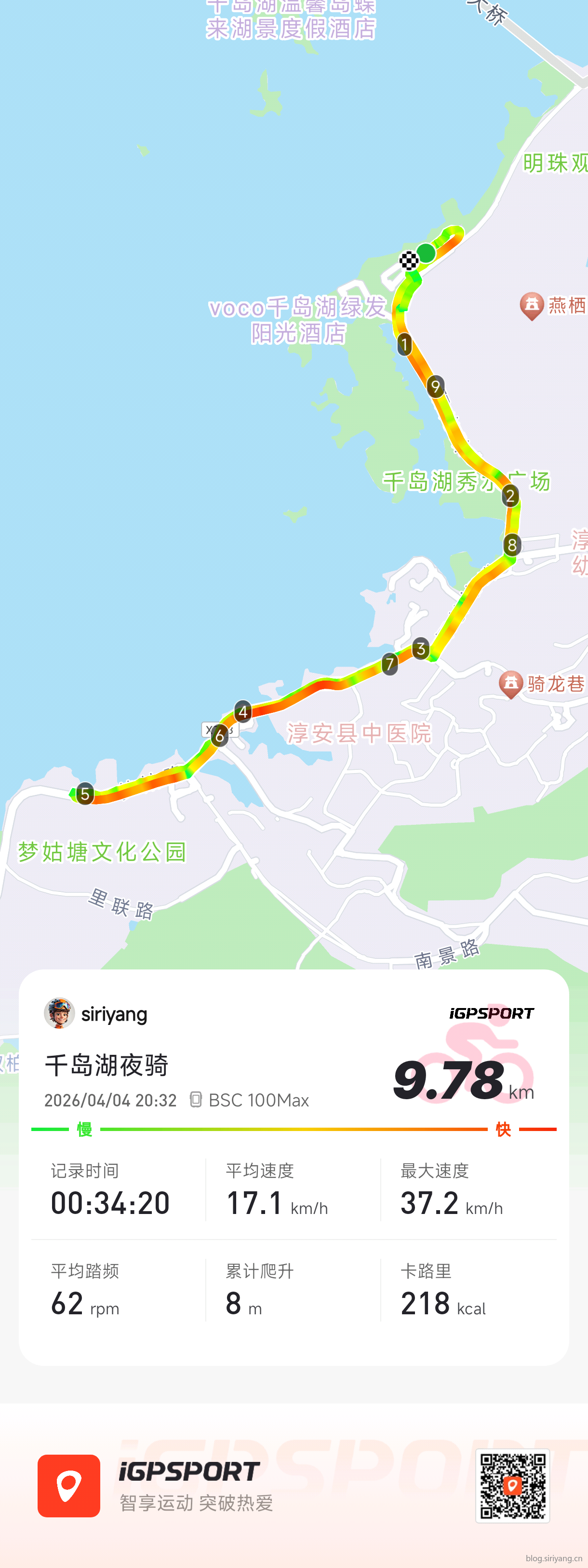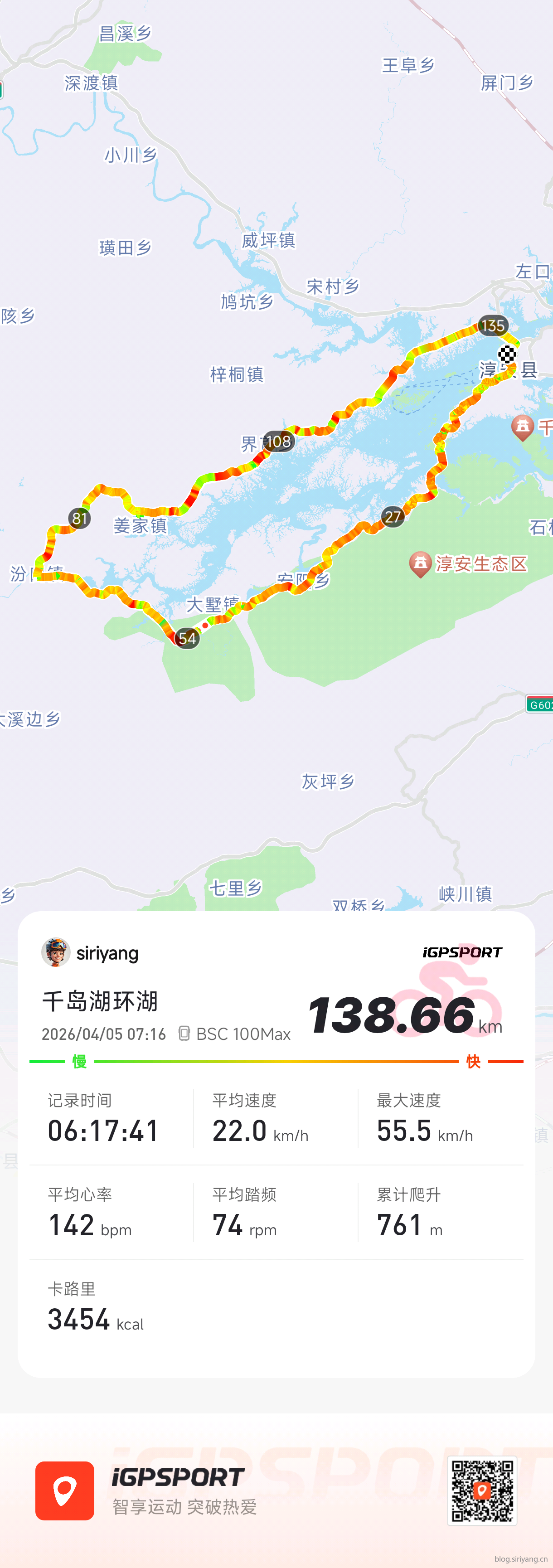 换衣服休息的时候,遇到一个骑折叠车的哥们儿寒暄了几句,他说他最近几年每年都回来千岛湖骑一到两次。别看骑的是折叠车,我们几个根本跟不上他的速度,没过多久就被甩的没影了。所以说姜还是老的辣呀。